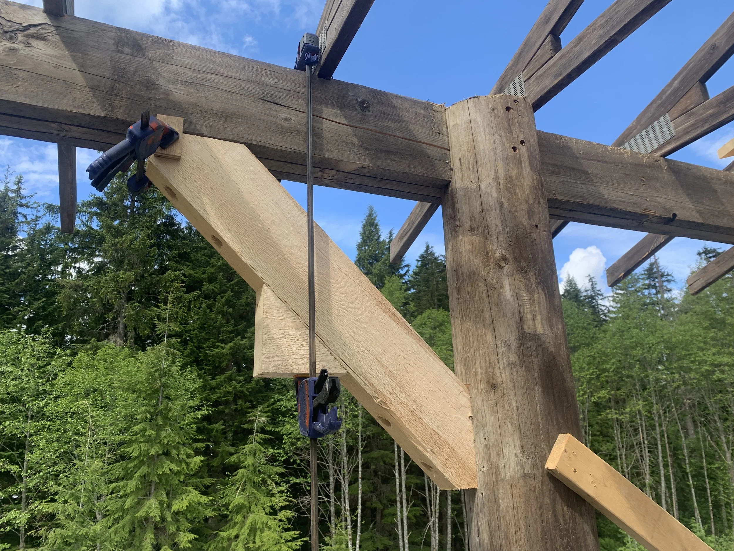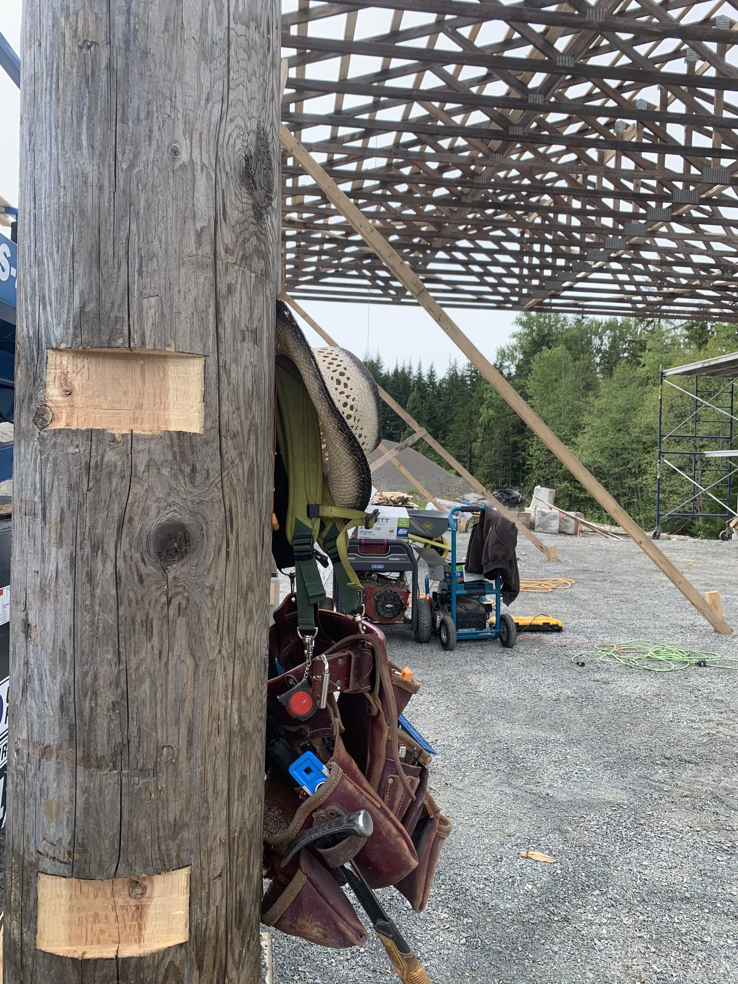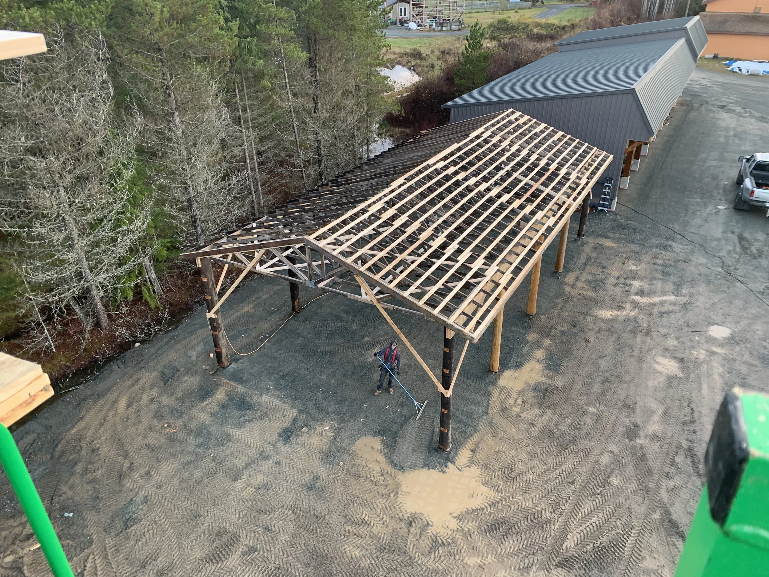 3 of these structures were built on-site for Nedcan, this open timber shelter uses heavy log posts and sawn timber trusses to create a durable, ventilated storage space. Joints are a mix of through-notches, plated connections and bolted brackets to balance traditional detail with modern strength. Priority was robustness in a wet coastal climate, and maintainable framing details.
