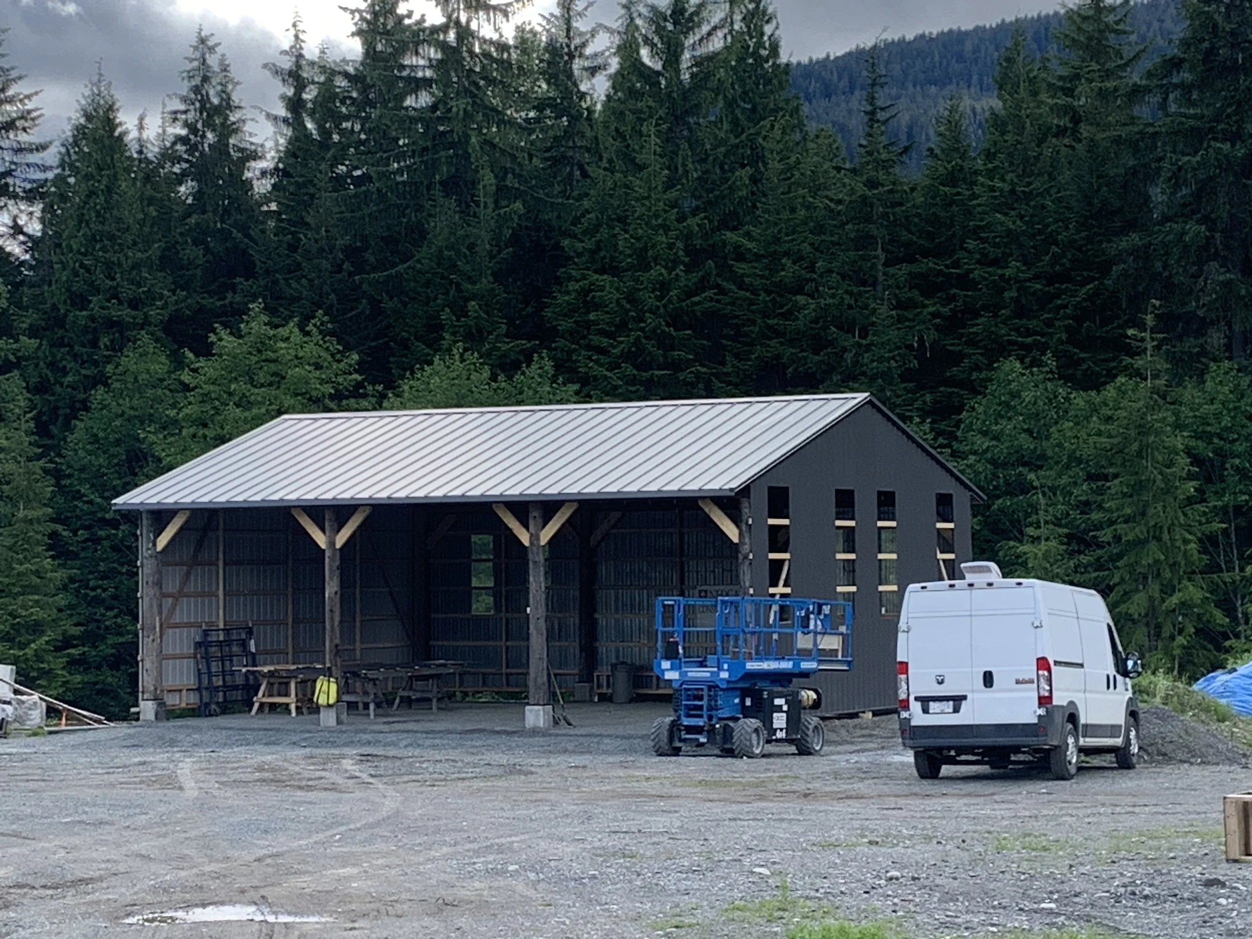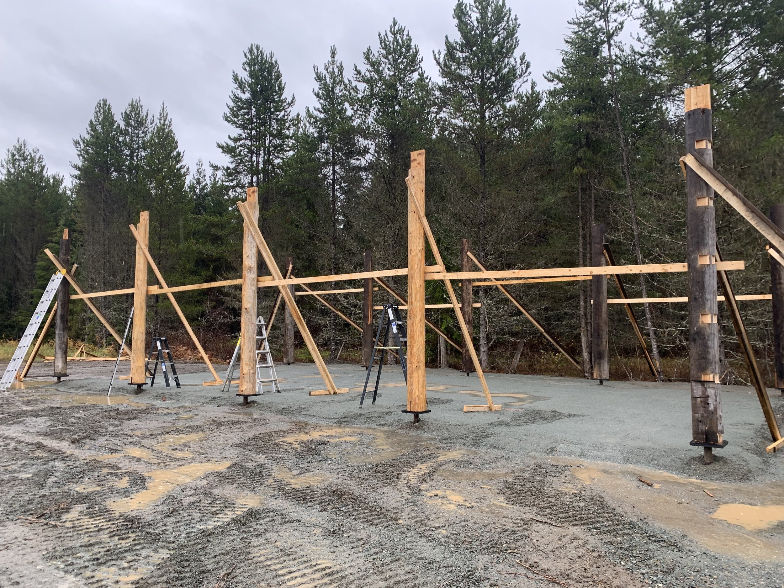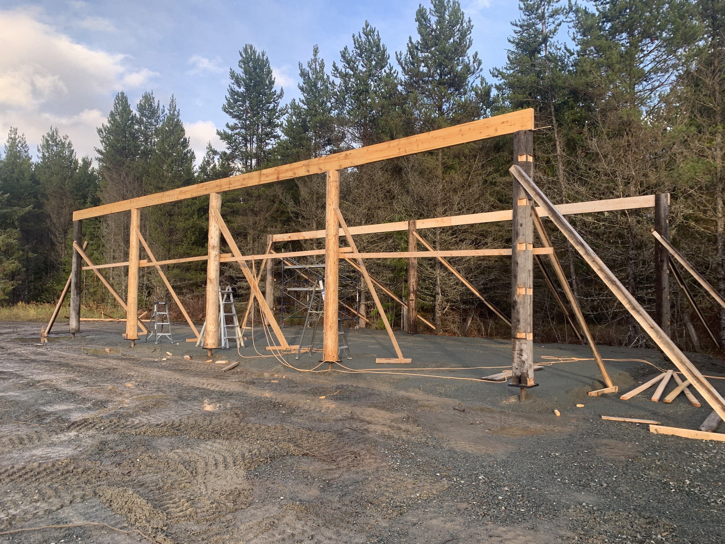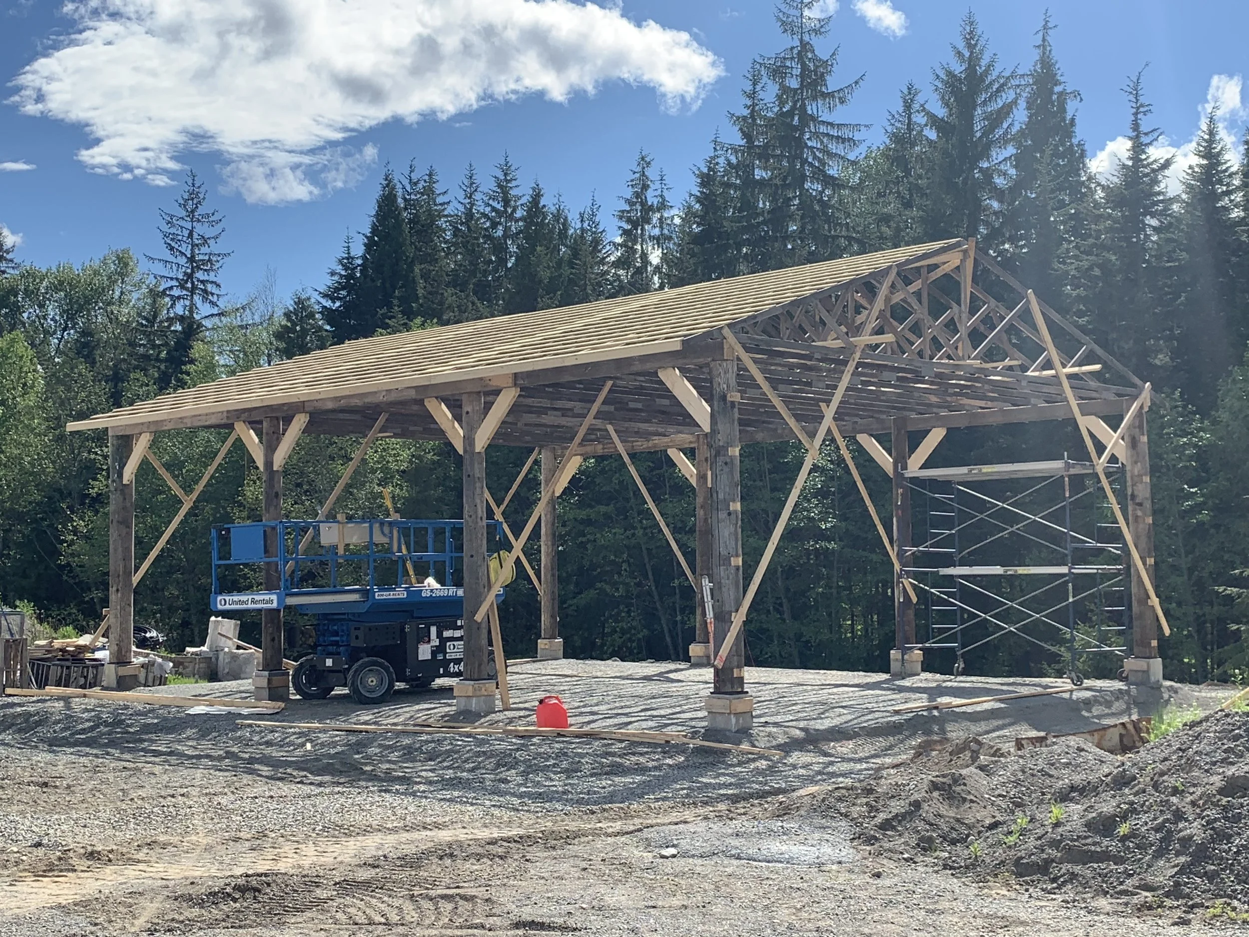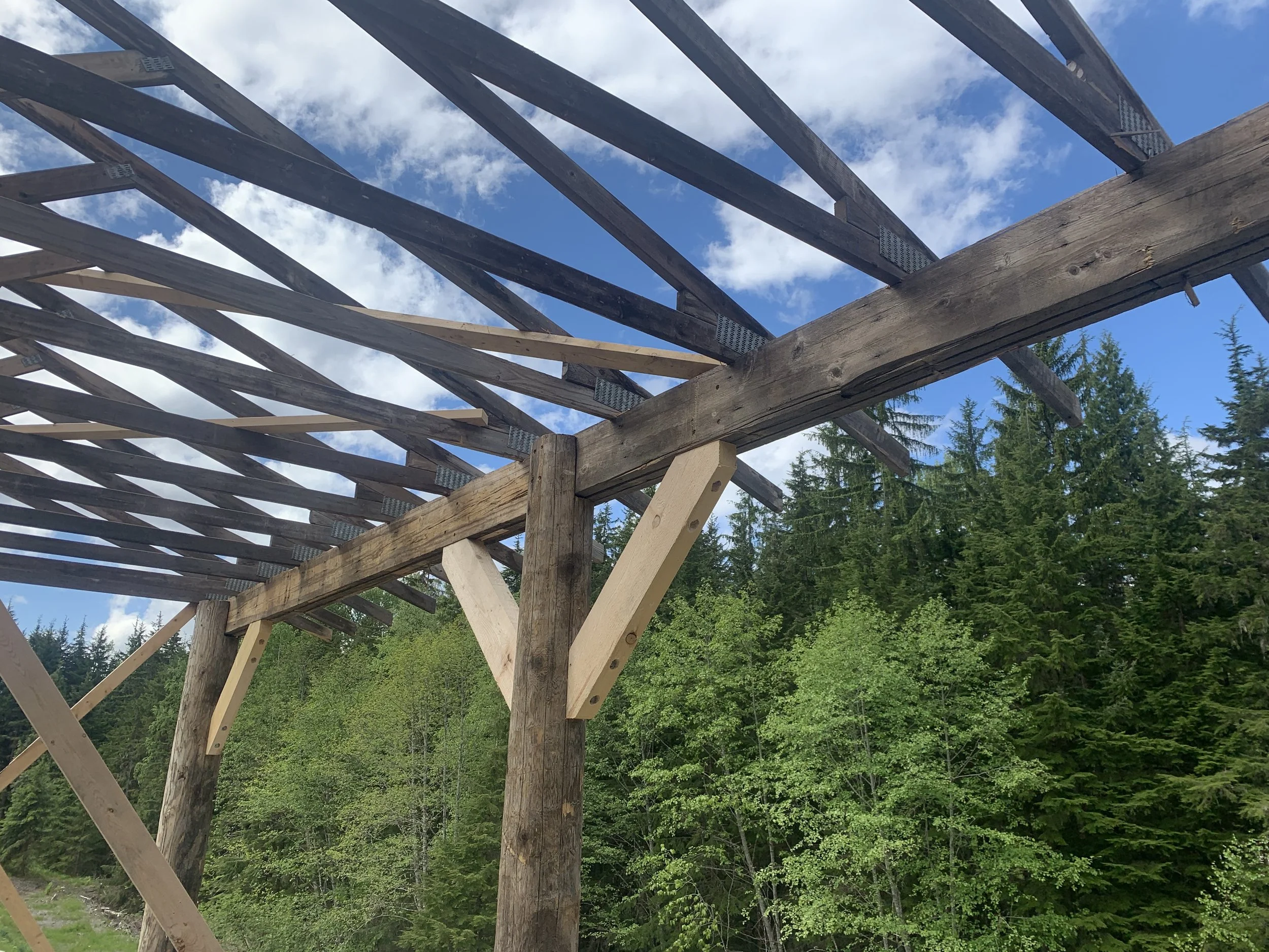 Large-scale post-and-beam shelter with reclaimed log posts, beams and trusses