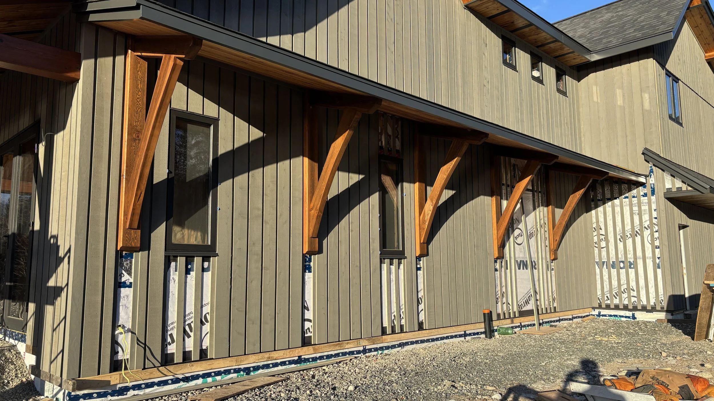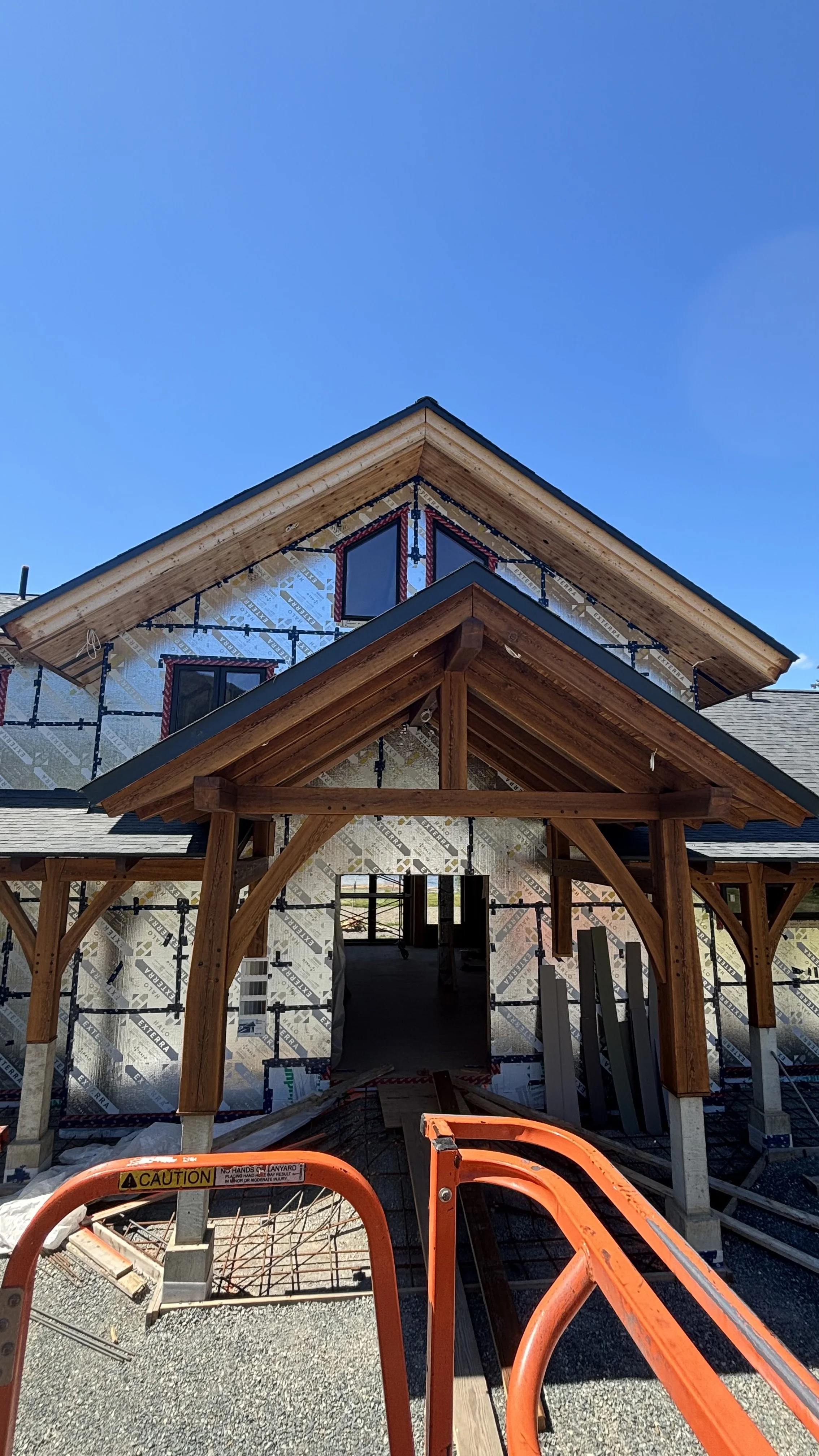 Custom timber-frame entry and porch designed and built by Jeremie Drouin which Saminthemaking helped in the assembly