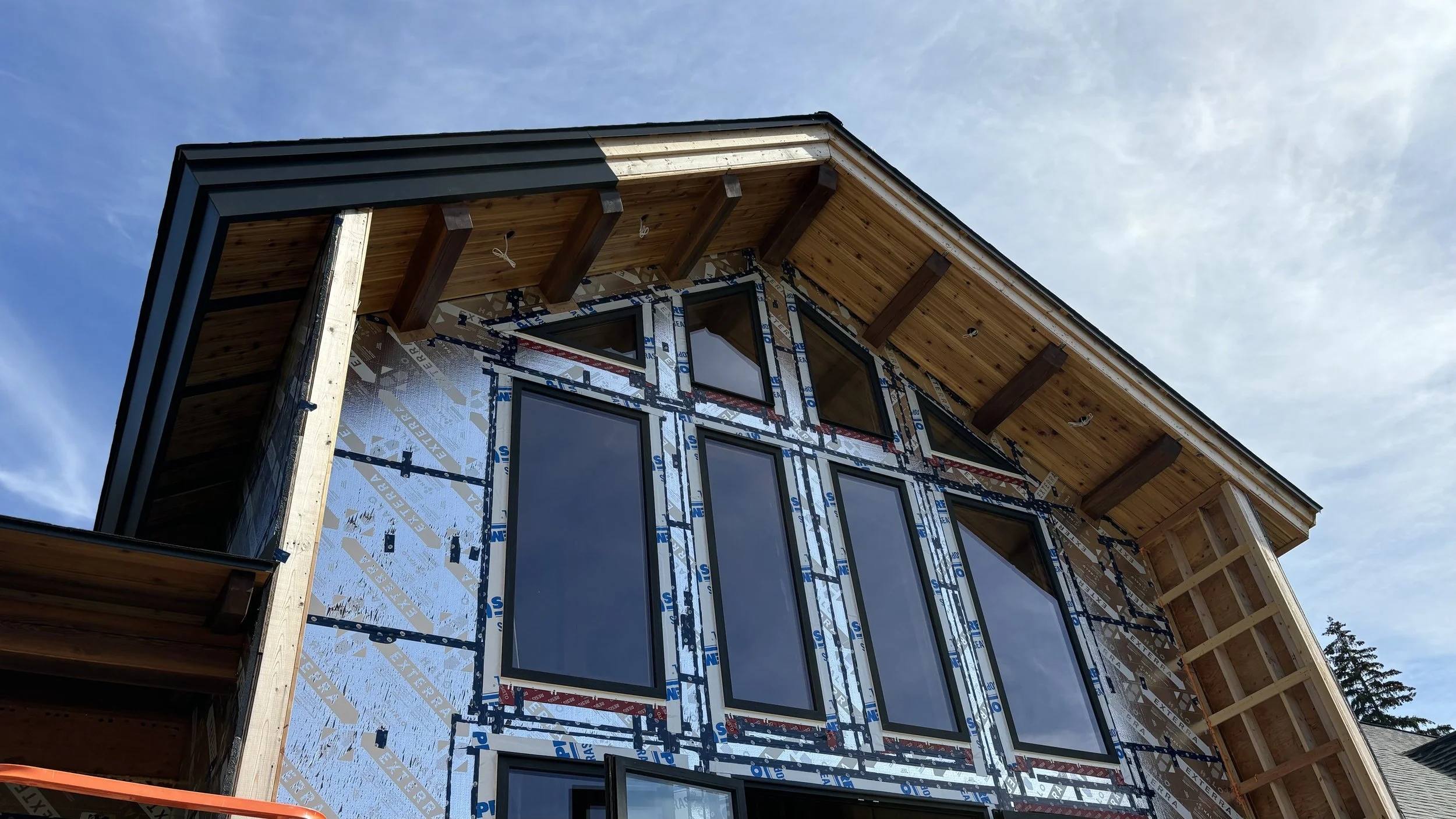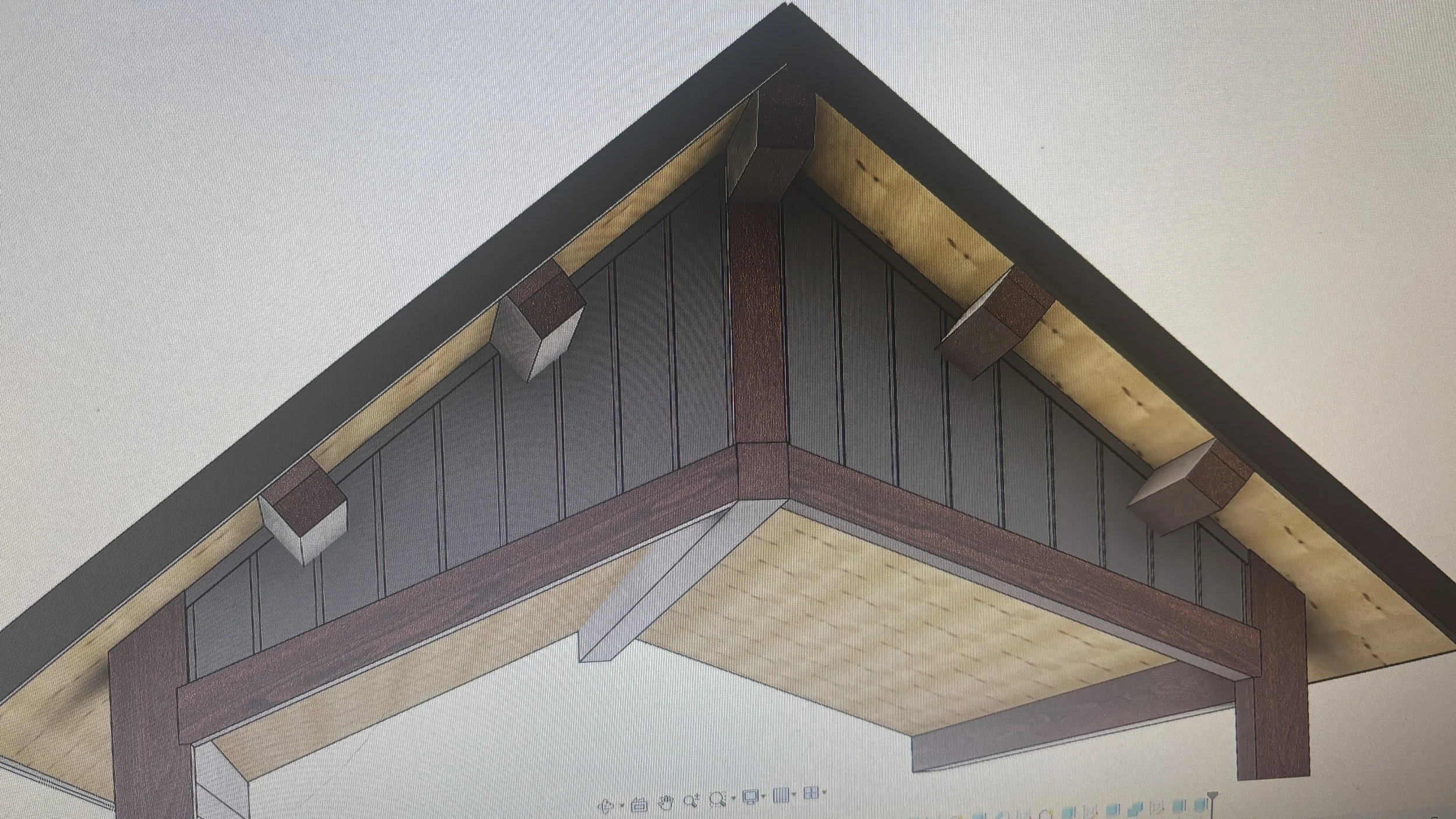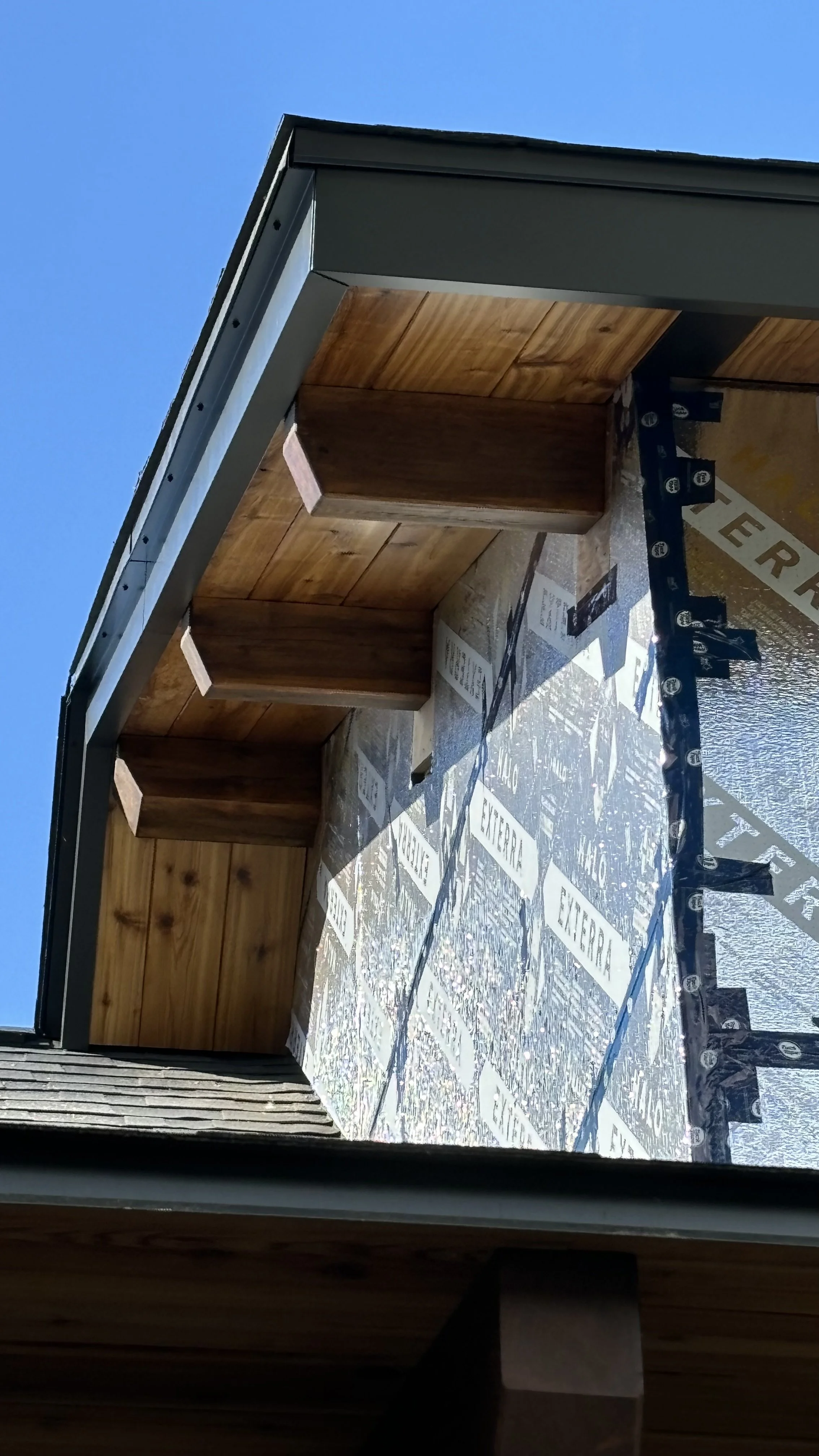 Decorative beam extensions milled from hemlock. Non-structural. Red cedar tongue-and-groove soffits set behind a custom metal fascia.