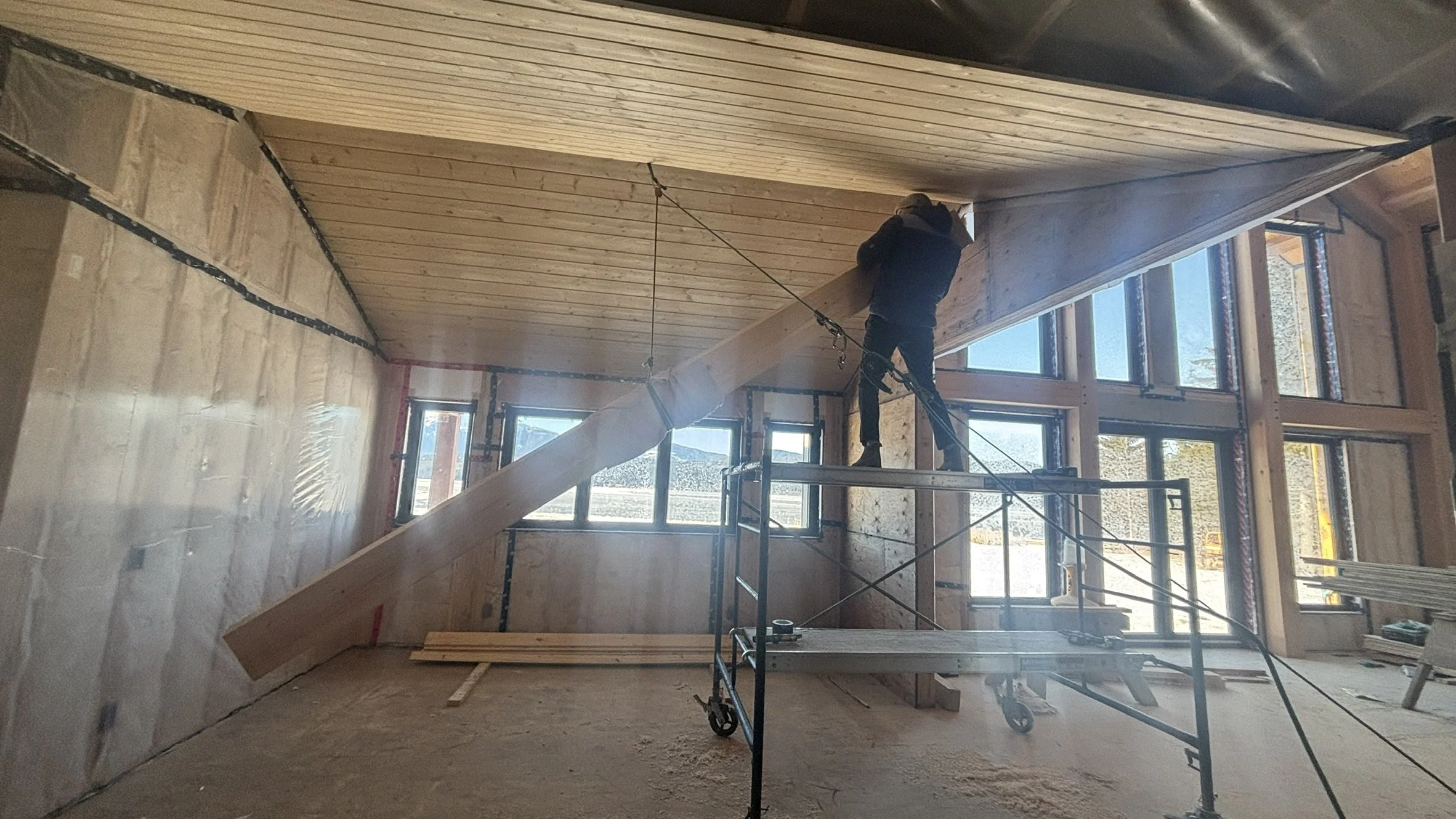 Rigged, lifted and set: exposed hemlock ridge 1 of 4 beams getting installed