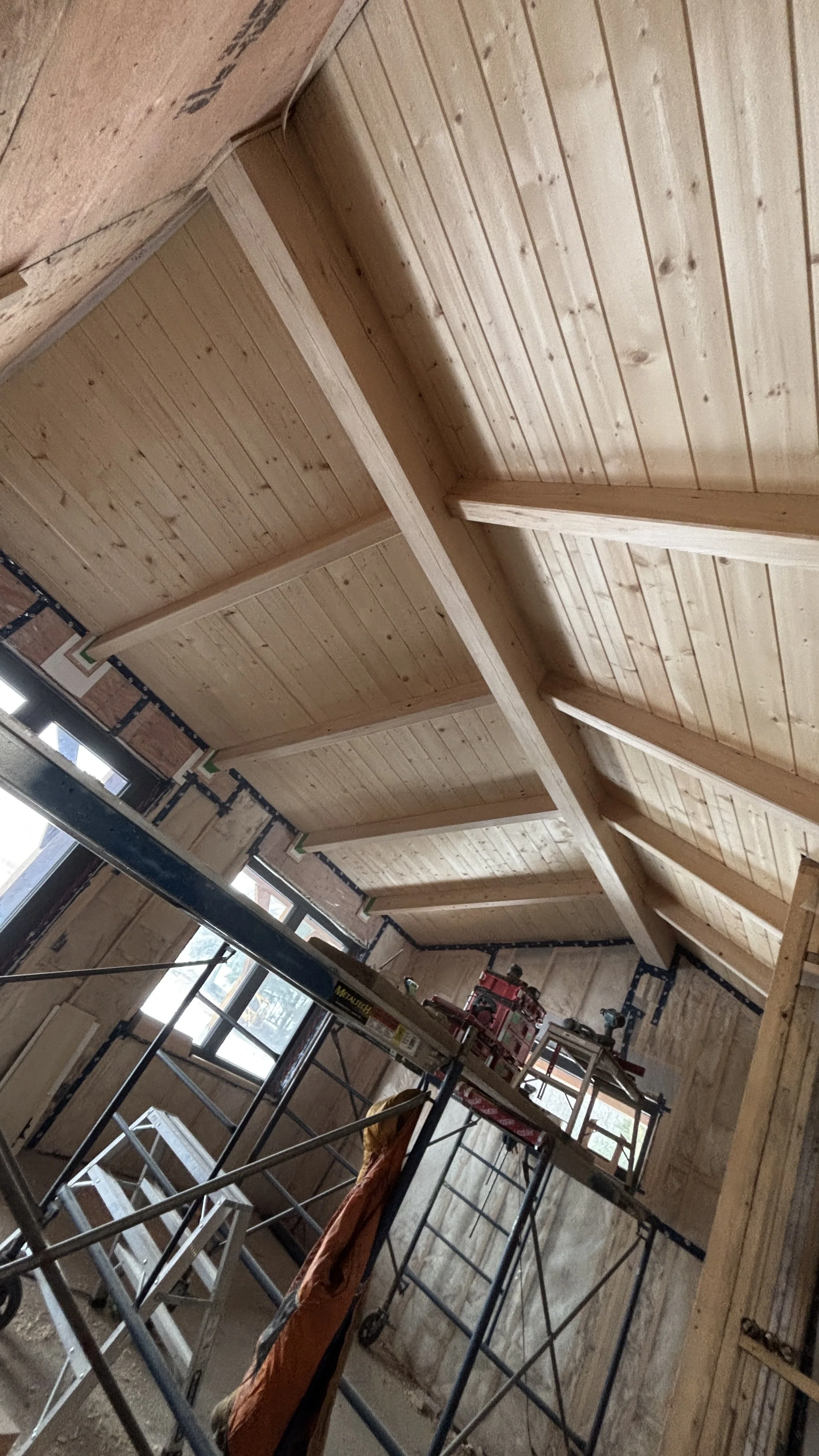 Decorative, non-structural hemlock beam and rafter assembly in the master bedroom. Clear finish left natural to show grain. Installed over tng pine.